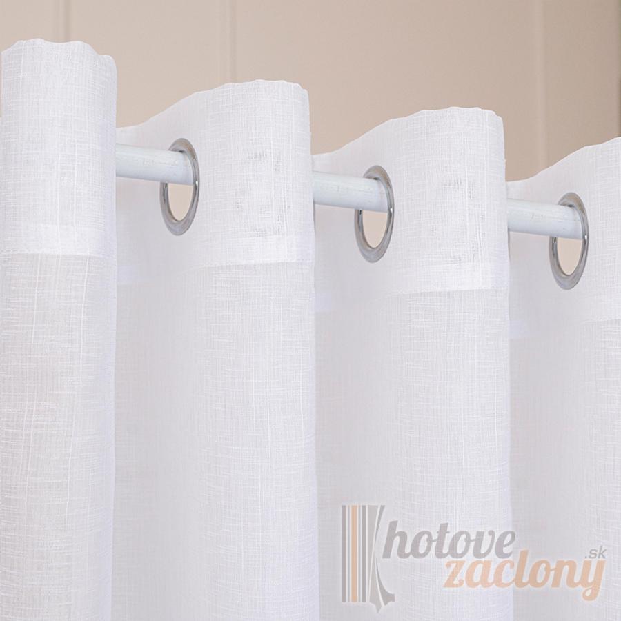 Záclona má kovové krúžky, ktoré sa navliekajú priamo na tyčovú garnižu bez potreby háčikov.